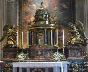 The Priest Approaches and Kisses the Altar: The altar is a symbol of Christ. In it are cut five crosses to recall the five wounds of Christ. The altar also represents the Church and has embedded in it the relics of her saints. The priest comes to the altar to celebrate the Sacrifice in the Church's name. Because of the glory surrounding the altar upon which the divine Sacrifice will be made, the kiss of the priest unites the Church to Christ, its Redeemer.